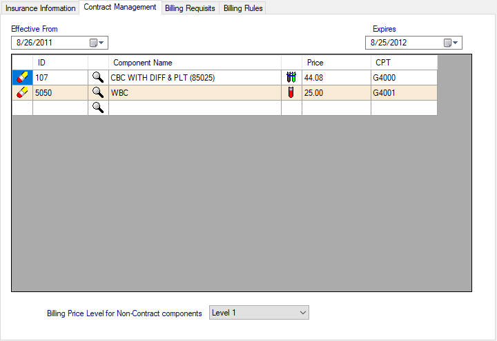 Select this tab to enter a new or modify an existing contract between the lab and the payer.
