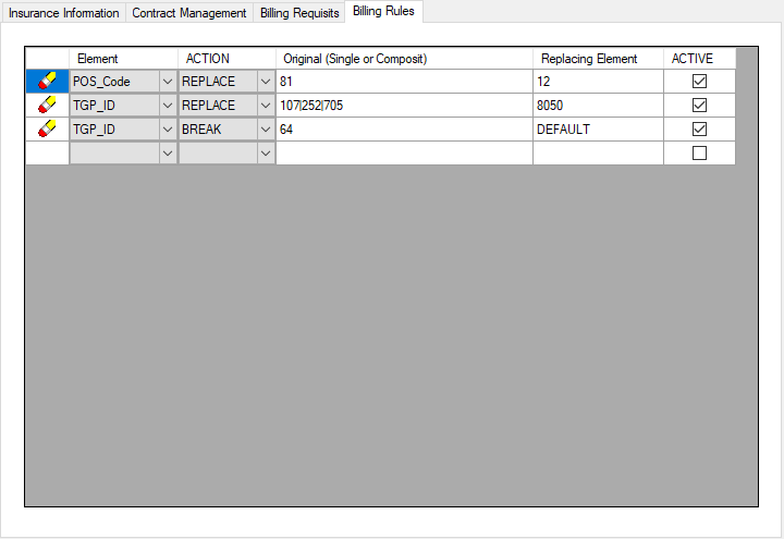 The Replacing element is the target output of the action. For a replace action, this element value will replace the original value of the element. The BREAK action is applicable to the billable components like a Gorup or a Profile. This action will transfer the constituents of the original Billable or Profile.