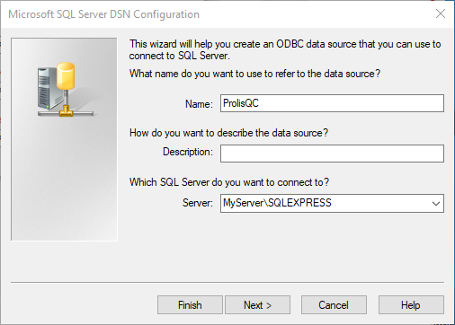 f. Enter the Prolis Server, setup in the ODBC adminstrator. For example MyServer, MyServer\SQLEXPRESS or 127.0.0.1\SQLEXPRESS.
